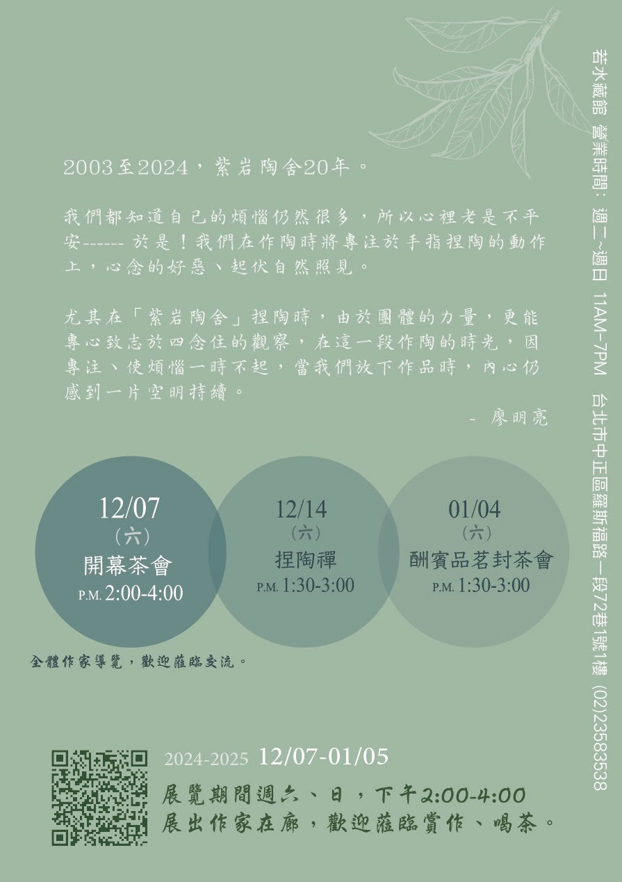 展覽期間週六、日,下午2:00-4:00展出作家在廊,歡迎蒞臨賞作、喝茶。