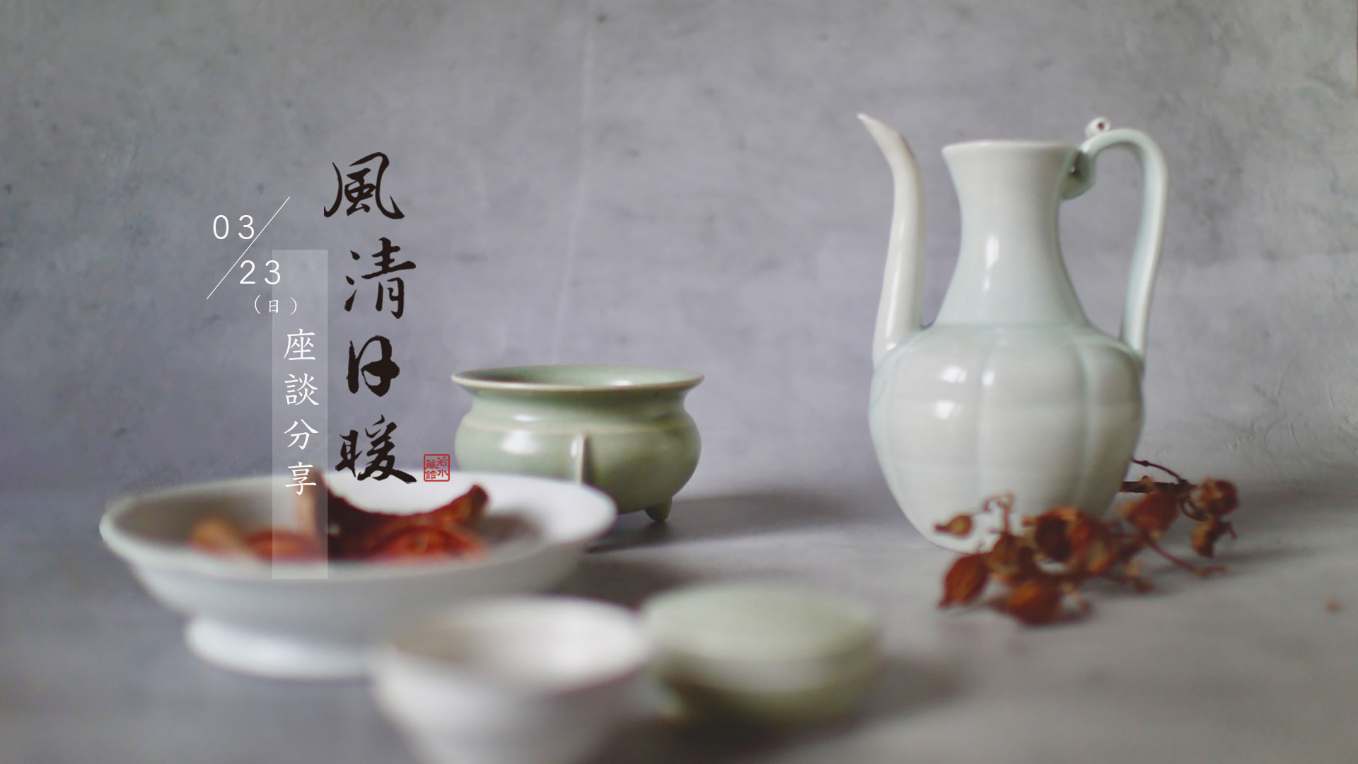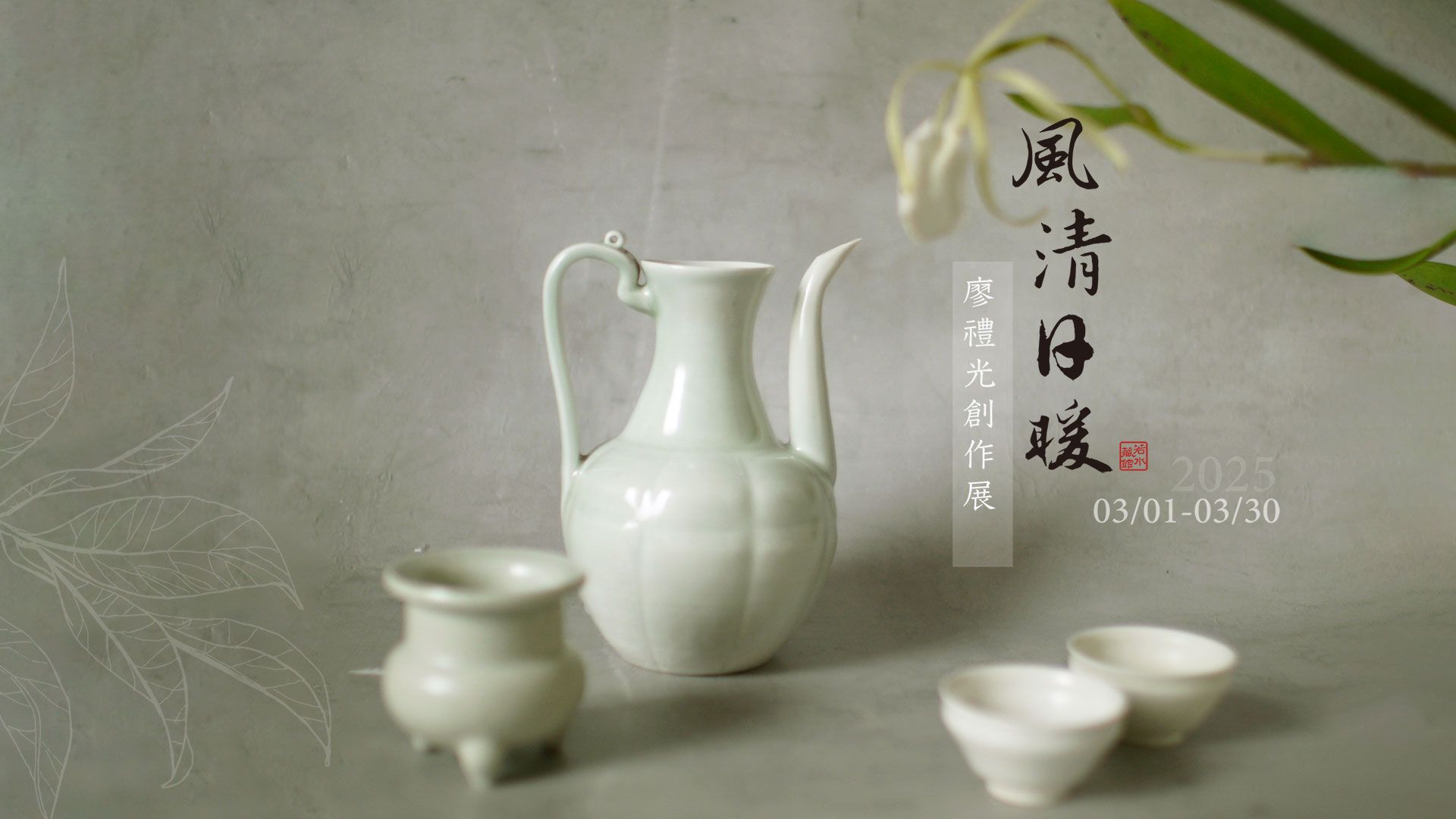 「 此次展覽以茶道具為主,並輔以香道具及部分酒器。作品以簡約純淨的設計為基調,搭配釉色溫潤內斂的白瓷與青瓷,展現出素雅清逸的風韻與高雅氣質。